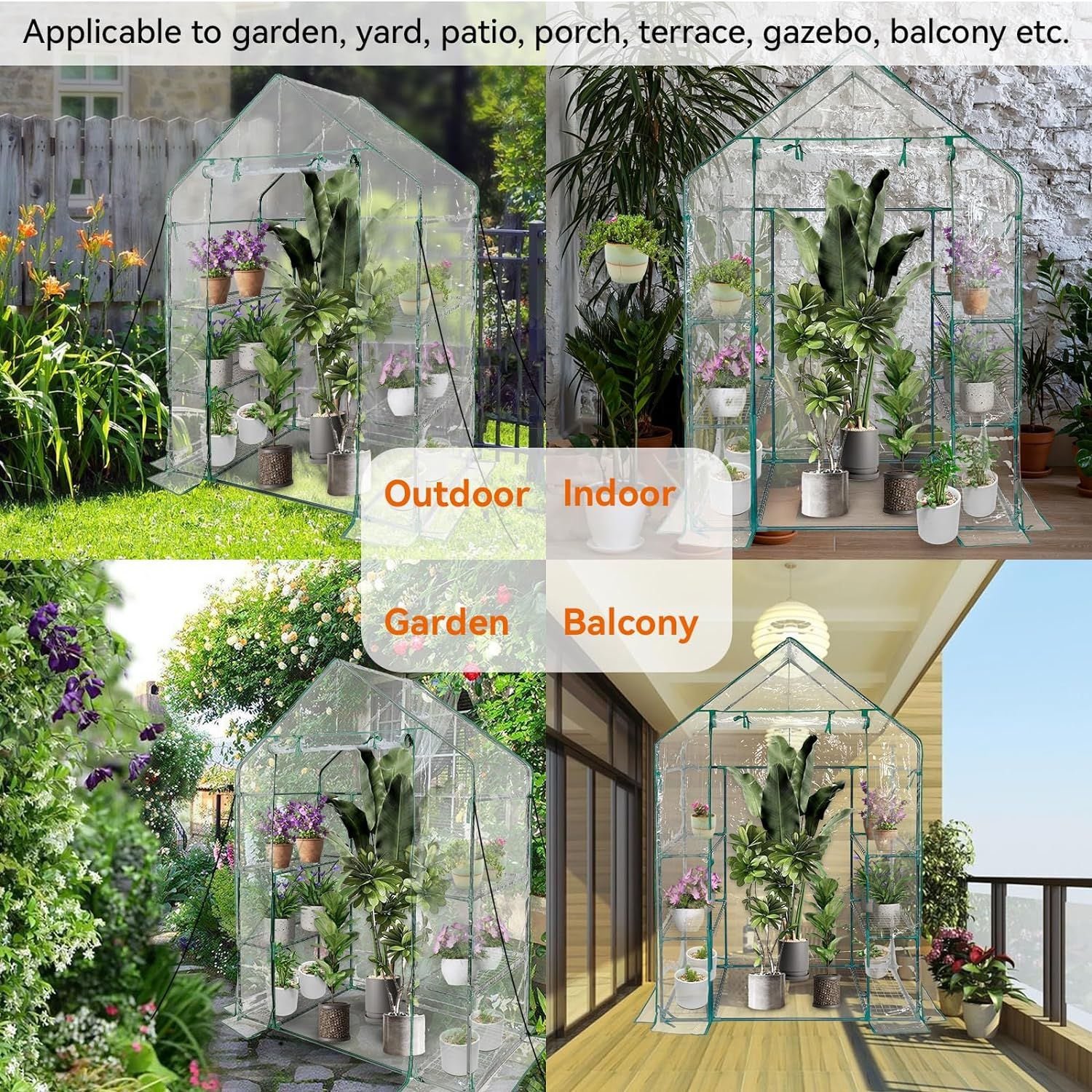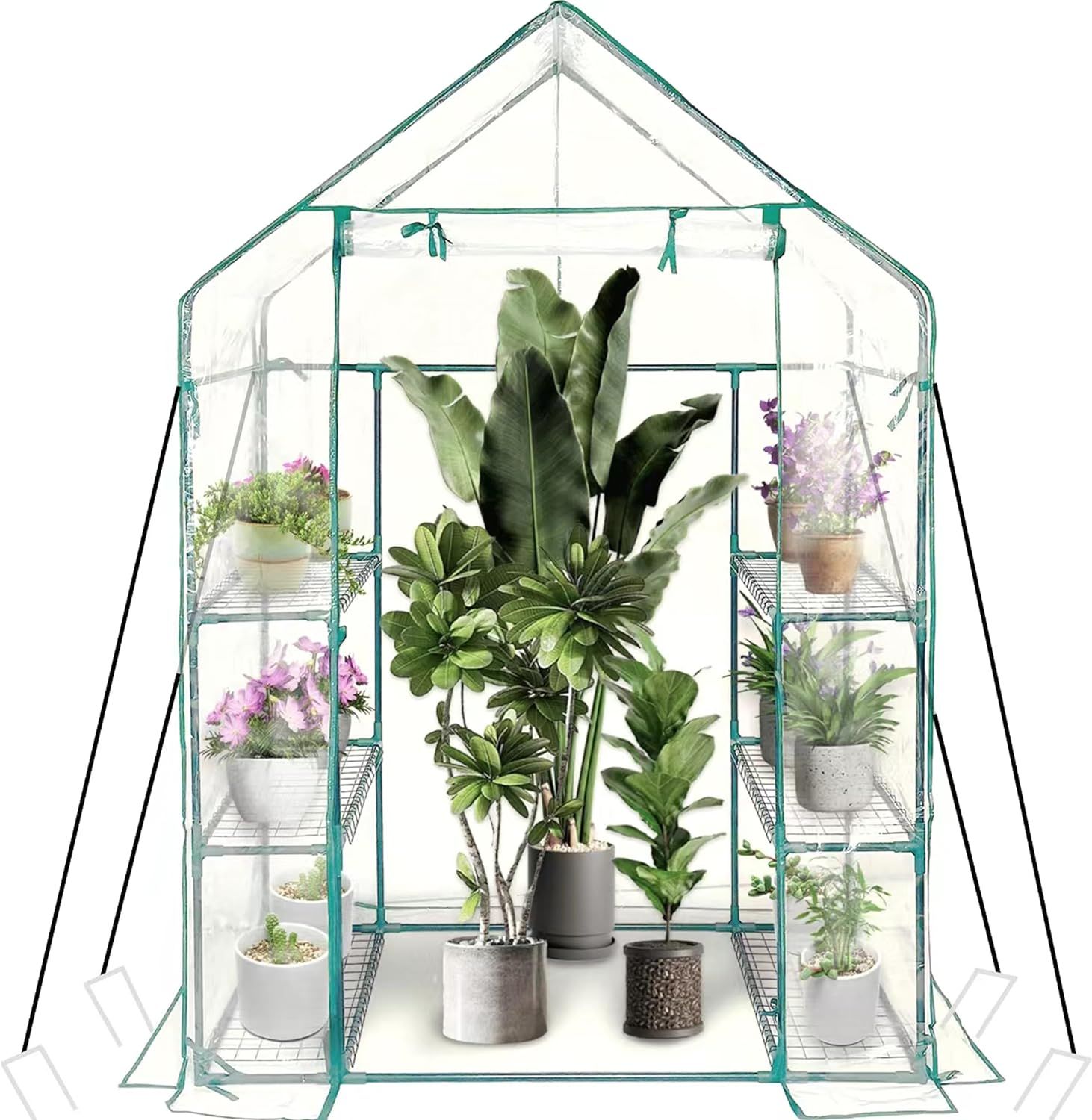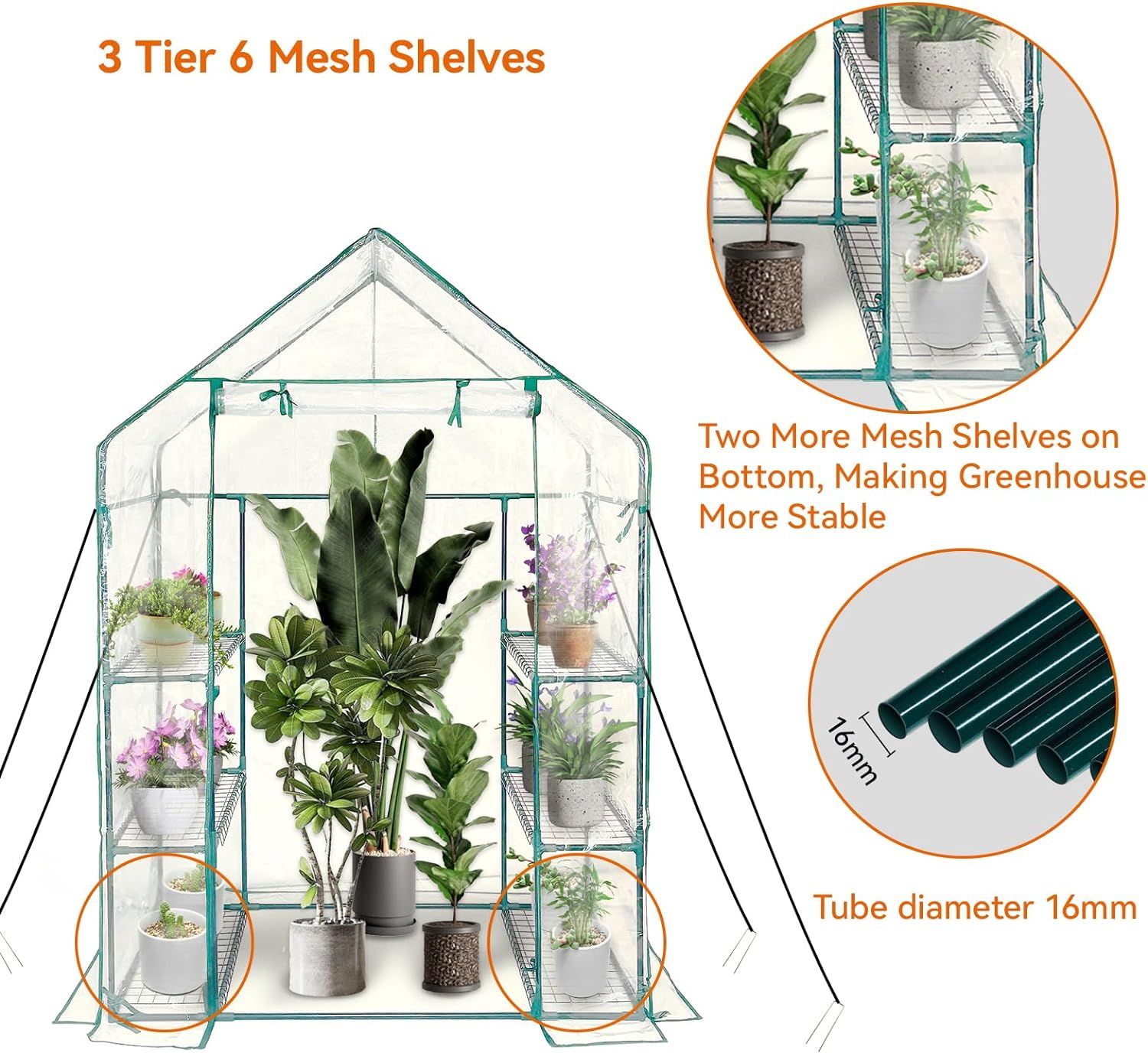 Do you want to care for plant growth all the season? Greenhouse kits for outdoors protects your plants from frost, excessive sun exposure, and also keeps the interior moist. Closing the roll up door of the green house can prevents small animals from damaging the plants. Relatively constant temperatures and moist conditions will allow plants to grow earlier and extend the growing season.This Mini Greenhouse provide the perfect solution for those smaller gardens that cannot accommodate a conventional greenhouse. It can protect your plants from too much heat or cold, shield plants from dust and gale, and help to keep out animal. It has a strong metal frame and green PE cover with zips for easy access and ventilation. Inside with shelves, ideal for pots and seed trays.Features:Material: Green PVC Cover, Powder coated Metal TubeWeight Capacity: 17 lbs each shelfShelves: 3 Tier 6 Wired ShelvesThe roll-up door design is easy to access and take care of your plants. Opening the roll up door when the climate is suitable can also promote air circulation and plant growth in the greenhouseThe wired shelves are fully painted and welded to make the wire crisscross, which has superior rust proof and load-bearing capacity.Equipped with ground spikes, used with ropes to keep your greenhouse stable to protect your plants, seeds and flowers from the strong wind2 Velcro Side Windows for summer time ventilation and ObservationIndoor and Outdoor Greenhouse for Garden/Patio/Backyard/ BalconySpecification:Product Dimension: 55"(L) X 27.5"(W) x 78.7:(H)Door Dimensions: 34"(W) X 61"(H)Window Dimensions: 11.8"(W) X 11.8"(H)Package1 X Greenhouse for Outdoor.1 X InstructionTIPS:Suggest to use a rubber mallet to make sure all pipes joint tightly **suggest to put a heat lamp in it and stake it well when use in Winter