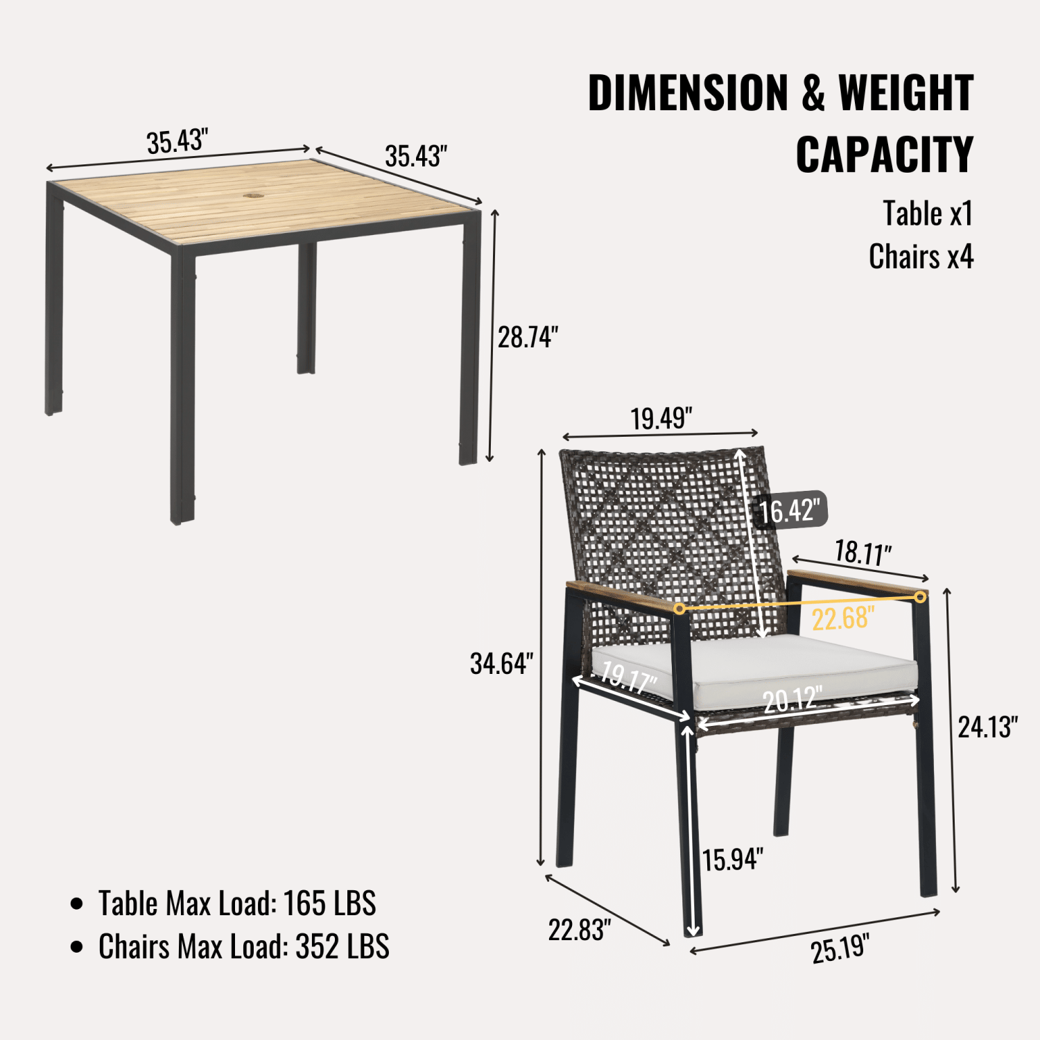 NATURAL LOOK TABLE: Dining patio furniture set brings a unique blend of rattan and wood. The natural look from sustainable solid acacia wood and the modern look of coffee brown rattan is perfect for any space. Complete the assembly with few steps and enjoy leisurely moments outdoors. Enjoy a cozy outdoor dinner with family and friends.