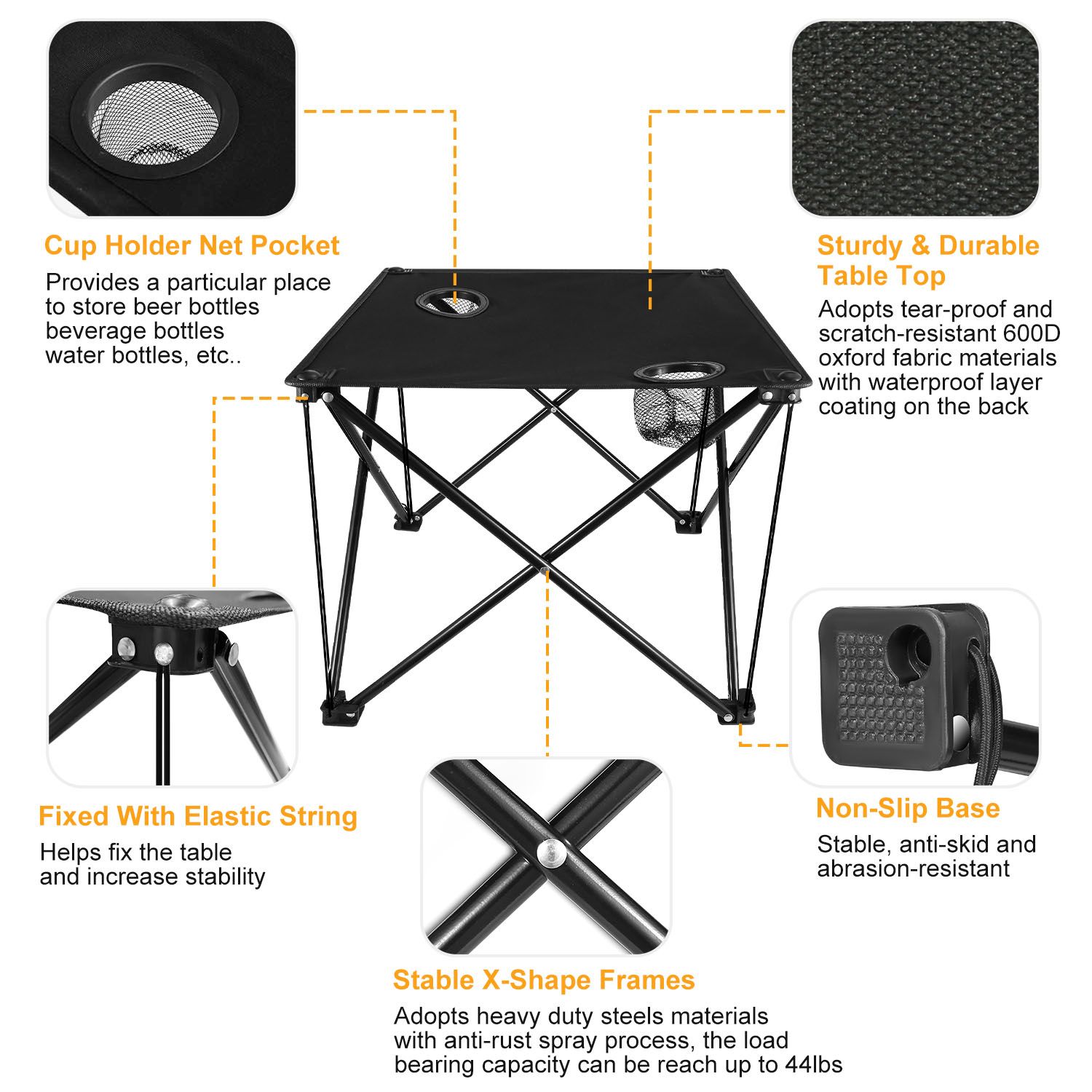 *STURDY & DURABLE TABLE TOP: Made from thickened 600D oxford fabric materials, the table top of our table is tear-proof, scratch-resistant, abrasion-resistant and stain-resistant. And its back side is coated with waterproof layer to protect against water permeation.