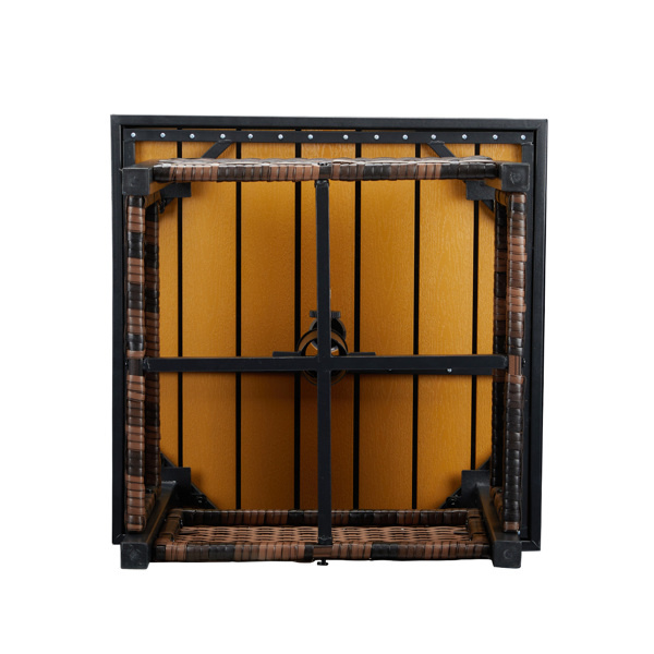 Enhance your outdoor living space with our Outdoor Wicker Side Table, designed to blend seamlessly with any patio, garden, poolside, or deck setting. Made with a heavy-duty steel frame and high-quality PE rattan, this table is capable of supporting up to 110 pounds. The tabletop features a waterproof and moisture-resistant imitation wood material. The central umbrella hole allows for shade on sunny days, while the lower storage space is ideal for keeping magazines, towels, drinks, and snacks within reach. This table promises convenience, style, and a wide range of applications, both indoors and out.
