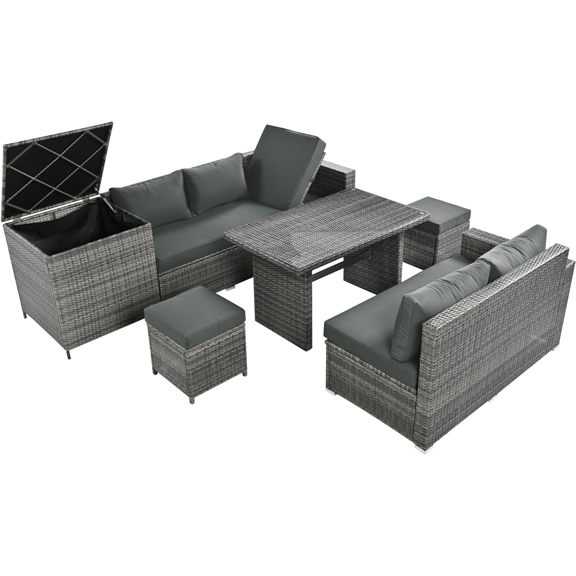 This patio rattan sofa set has a number of storage options that make it a great choice for outdoor use.The loveseat sofa features an openable seat that provides ample storage space for cushions and other items; keeping them out of sight and protected from the elements.In addition to the seating options; the set also includes a gas lift storage box that provides even more storage space for outdoor essentials and is perfect for storing larger items; such as outdoor pillows. Storage capacity for loveseat is 69 gallons and for storage box is 94.6 gallons