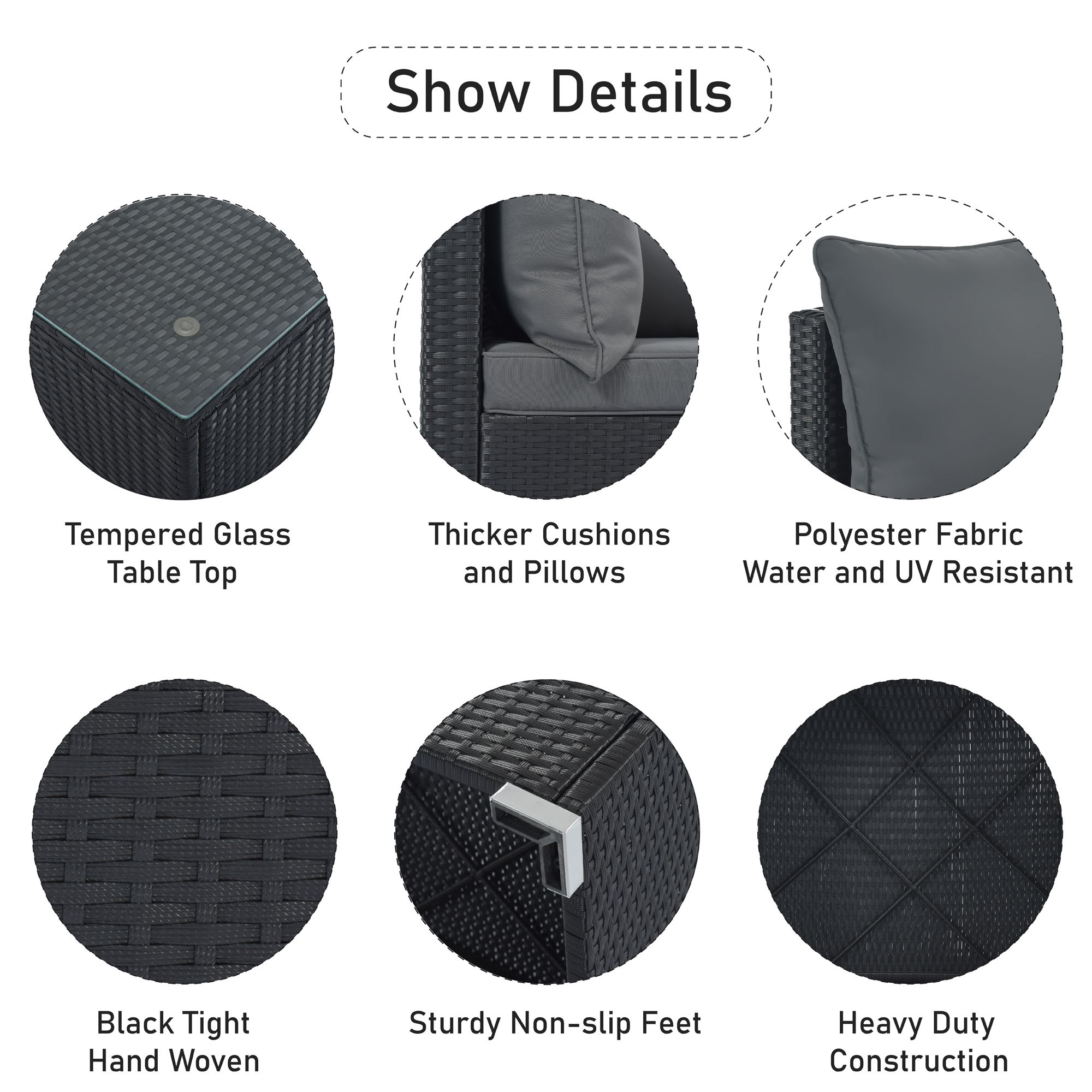 1.Perfect Design :This wicker sofa set is made of sturdy iron frame and top quality wicker, including 1 corner sofa, 4 single sofa, 2 ottomans and 1 coffee table. Gray hand woven wicker with the comfortable look and texture of natural wicker, thicker cushions and pillows for your ultimate enjoyment, safe and tough tempered glass, they all have high UV resistance and water resistance for years of use.