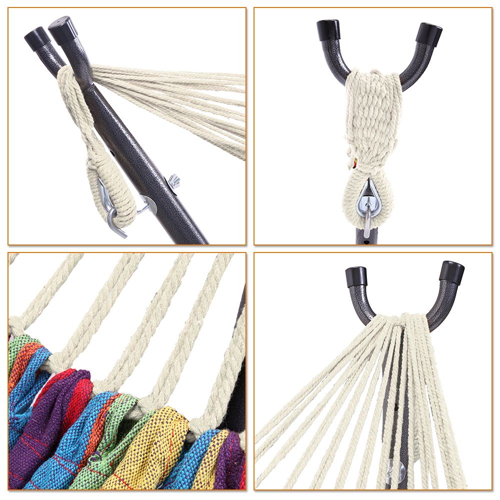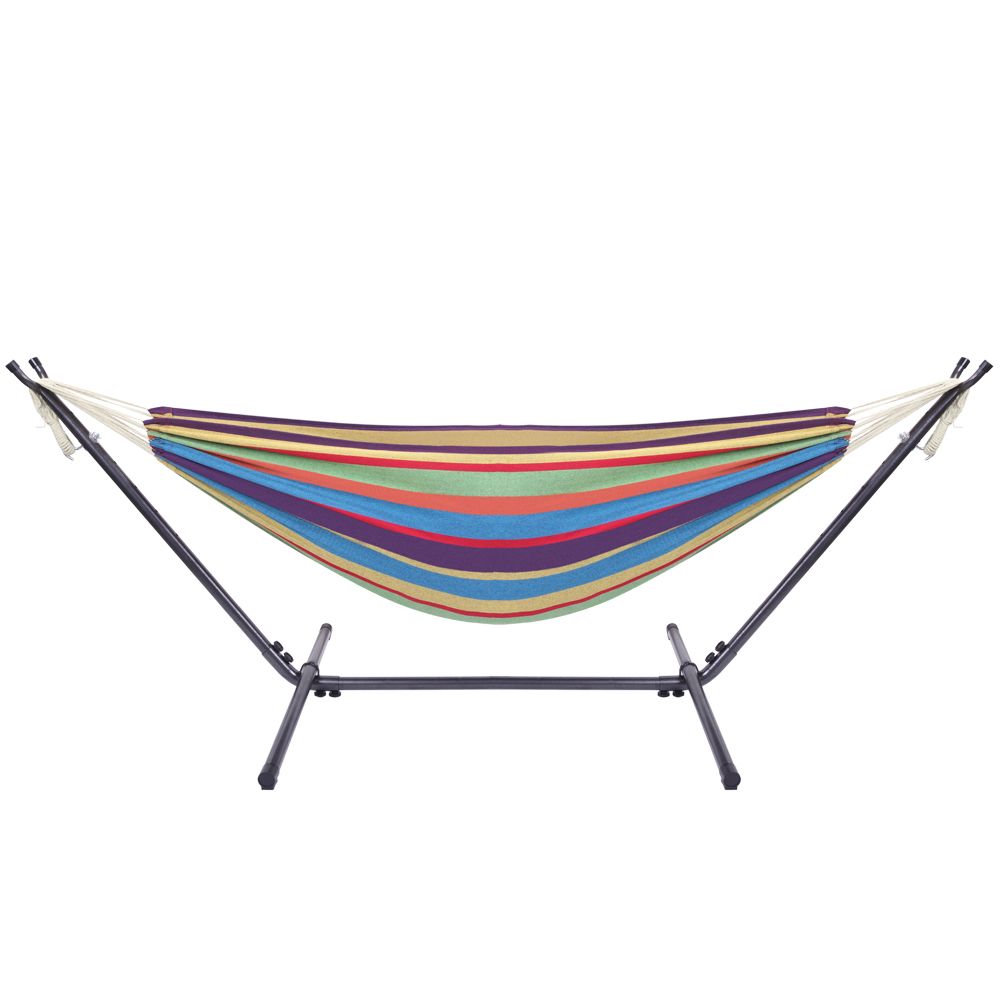 Enjoy yourself in our Portable Outdoor Polyester Hammock Set at any time! It is composed of a hammock, a hammock stand and a portable handbag. Each item in this offer is made with premium material and delicate workmanship, with ensured quality and durability. Thus, you can carry it along easily for all kinds of outdoor activities. Also, the hammock could bear up to 135Kg weight to the maximum so that even two persons are allowed to lie on it freely without any worry and concern. What are you waiting for? The intoxicating leisure time is waving its hands to you!